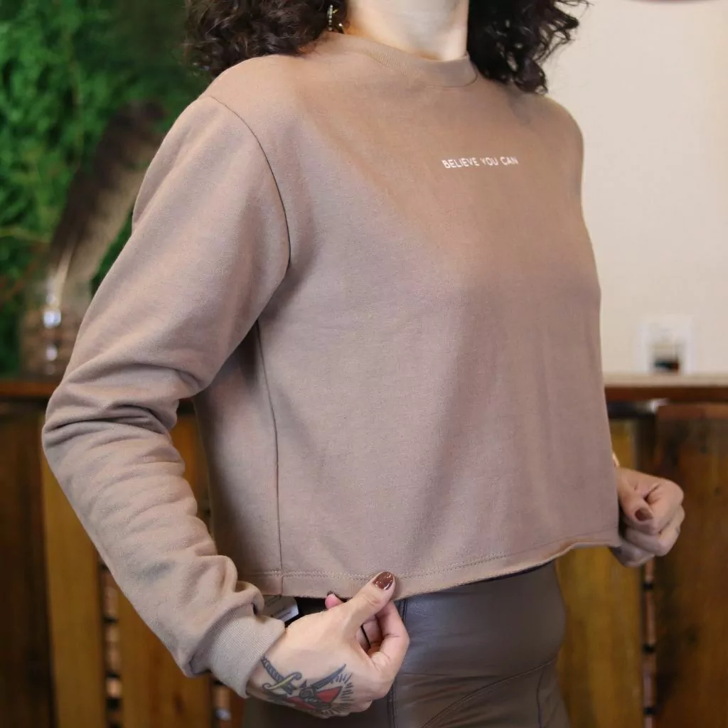 Com tecido de moletom leve, toque macio e modelagem confortável, ele traz a frase “BELIEVE YOU CAN” estampada no centro: um lembrete diário de força, fé e possibilidade.
